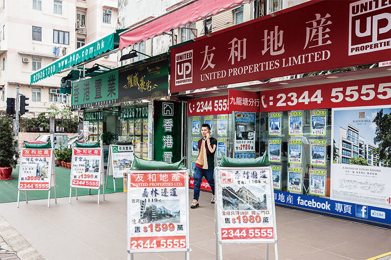 中共把高房價歸罪於香港地產商。圖為香港九龍區的房地產仲介門市。(AFP)