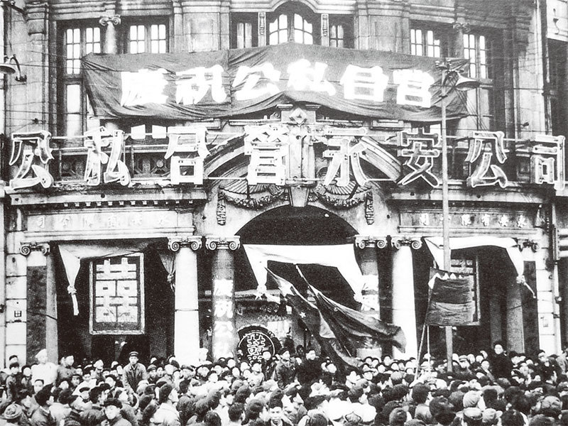 上海私企眾多,生產力強大,是中共推行「公私合營」奪財的重中之重。圖為1956年1月14日,中國最大的私營百貨商場上海永安公司實行公私合營。(公有領域)