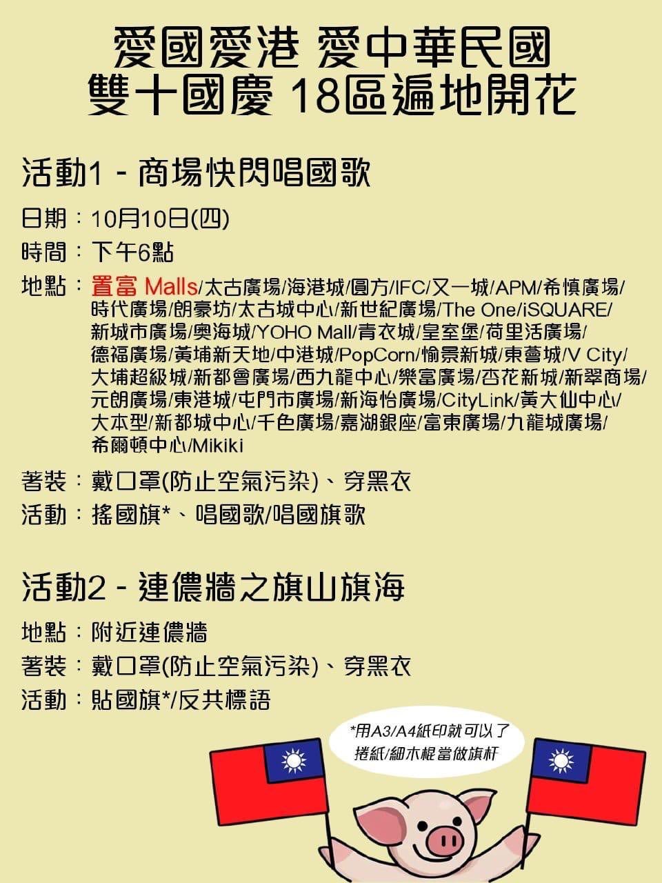 2019年10月10日是中華民國108歲生日,也叫雙十節中華民國臺灣國慶日,香港18區香港人,紛紛用不同方式參與中華民國國慶活動