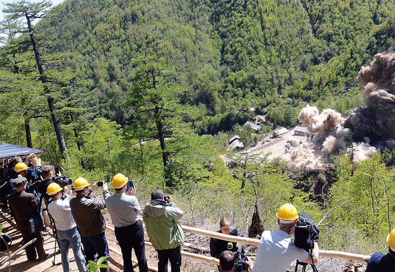 預言中的一些災難已被削減或化解。根據《格庵遺錄》的描述,在原來歷史的安排中,「天火」事件於2028年前後發生。圖為2018年5月25日北韓公布拆除豐溪里核試驗設施。(AFP)