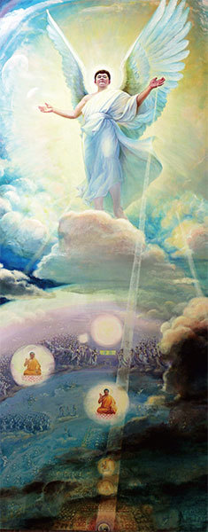 諸多中外預言都描述了在「大災難」中,將有一位「聖人」出世──信者和善良人將得到「聖人」拯救,進入歷史的嶄新紀元。圖為真善忍美展畫作〈主佛降臨圖〉,張昆崙、陳肖平,2007年。(法輪大法弟子藝術中心)