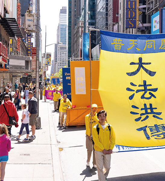歷史預言中「末劫」時期的大災難,因「大法」流傳世間而得到了減弱或消除。當今中國確有「大法」在傳,且已弘傳至世界各地。圖為2019年5月16日,來自六大洲的部分法輪功修煉者在紐約曼哈頓慶祝法輪大法洪傳27周年。(戴兵/大紀元)