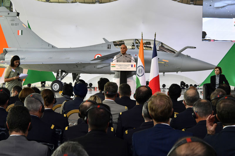 法國10月8日交付印度空軍訂購的36架「陣風」戰機。圖為印度國防部長拉傑納特.辛格(Rajnath Singh)訪問法國並出席交付儀式。(AFP)