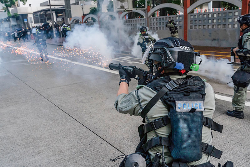 四中全會一結束,中共港警的暴力立即再升級,中共對香港實施「超限戰」,強化「以暴製亂」。圖為11月2日港警在灣仔狂射催淚彈,驅散抗爭市民。(Getty Images)