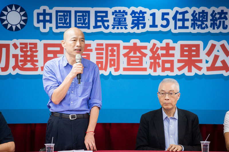 高雄市長韓國瑜(左)在國民黨總統初選民調中以44.805%支持度勝出,代表國民黨角逐2020總統選戰。右為國民黨主席吳敦義。(陳柏州/大紀元)