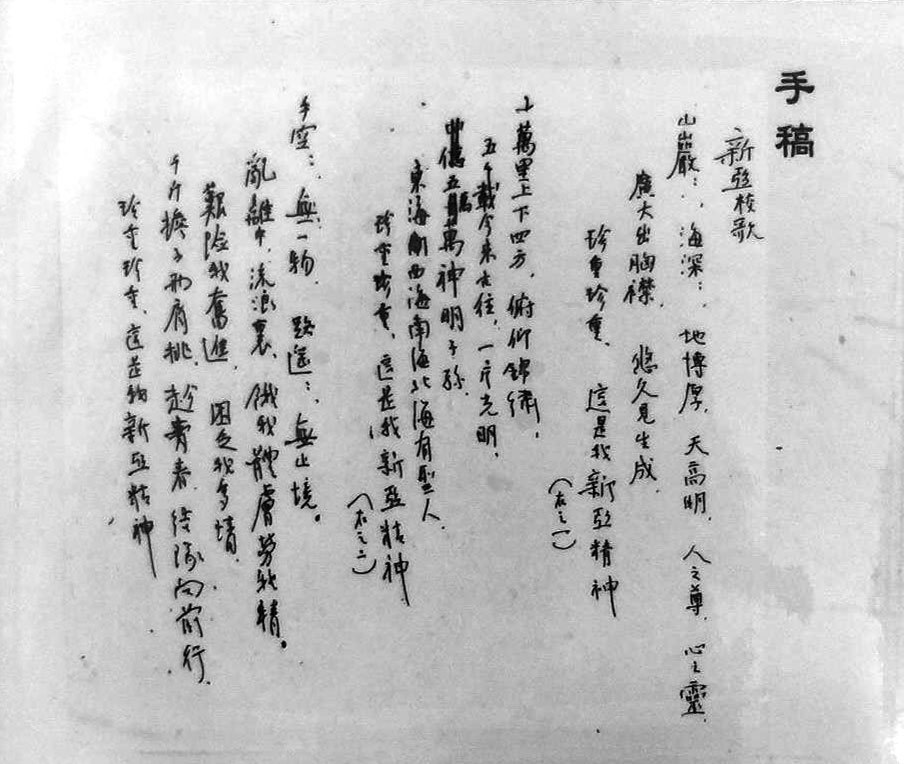 錢穆故居展示的新亞書院校歌歌詞手稿。(公有領域)