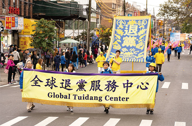中共是超過豬瘟、鼠疫千萬倍的終極禍源。快辦理「三退」拋棄中共保平安。圖為2019年10月20日,紐約布魯克林,法輪功學員遊行聲援3億4000萬勇士三退。(戴兵/大紀元)