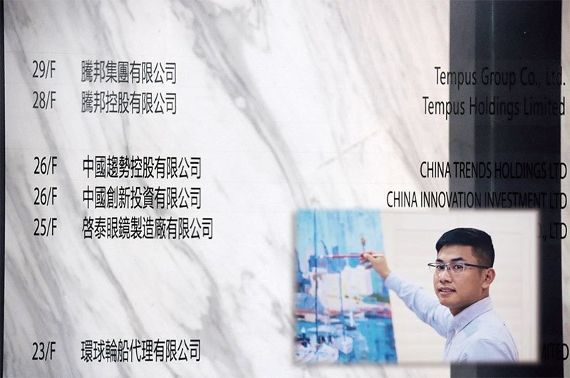 主修油畫的王立強,意外的進入香港公司中國創新投資有限公司。底圖為中國創新投資在香港大樓內的樓層指示。(中央社)