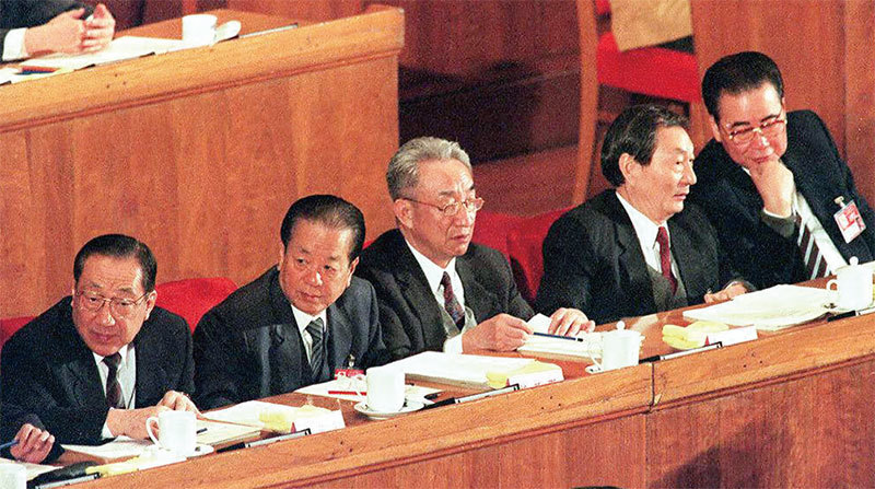 向心聲稱曾為中共高級官員鄒家華(右三)工作。鄒家華曾任中共國務院副總理,通過獲取外國軍事技術,幫助發展中共國防工業。圖為1997年中共兩會。(AFP)