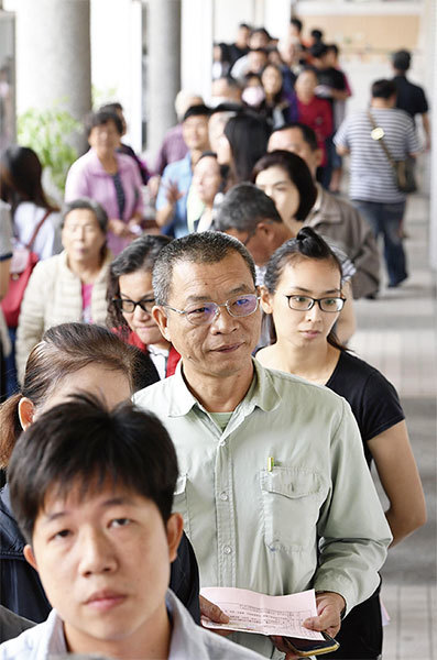 王立強表示,他參與操控臺灣2018年的九合一選舉。圖為2018年11月24日臺灣九合一選舉當日,高雄一投票所前排隊的人群。(Getty Images)