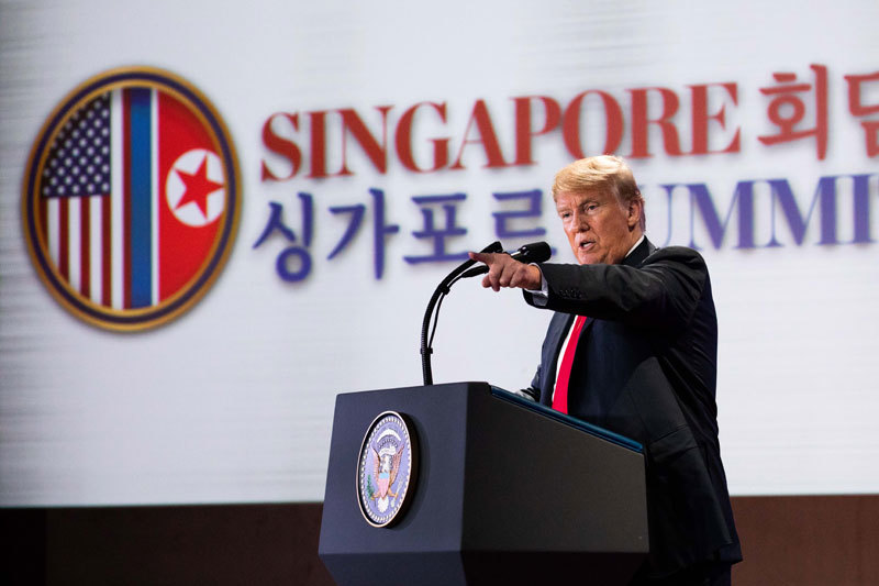 北韓宣布12月7日在西海衛星發射場舉行了重大試驗。特朗普隨即警告若北韓採取敵對行為將會損失慘重。圖為2018年6月12日新加坡特金會後舉行記者會。(Samira Bouaou/大紀元)