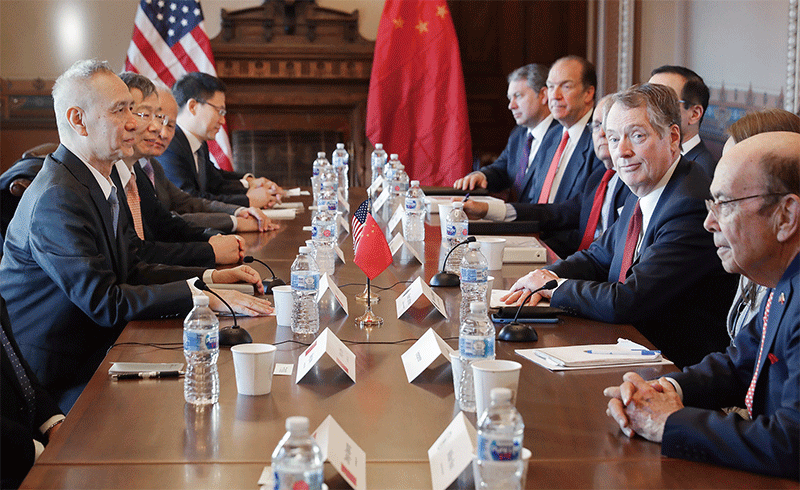 中美貿易談判,中共原想採用的拖延戰術失靈。2019年5月第一階段協議稿出來時,劉鶴(左一)曾被罵成是「賣國」,而習近平用各種方式向外界昭示他全力挺鶴。(Getty Images)