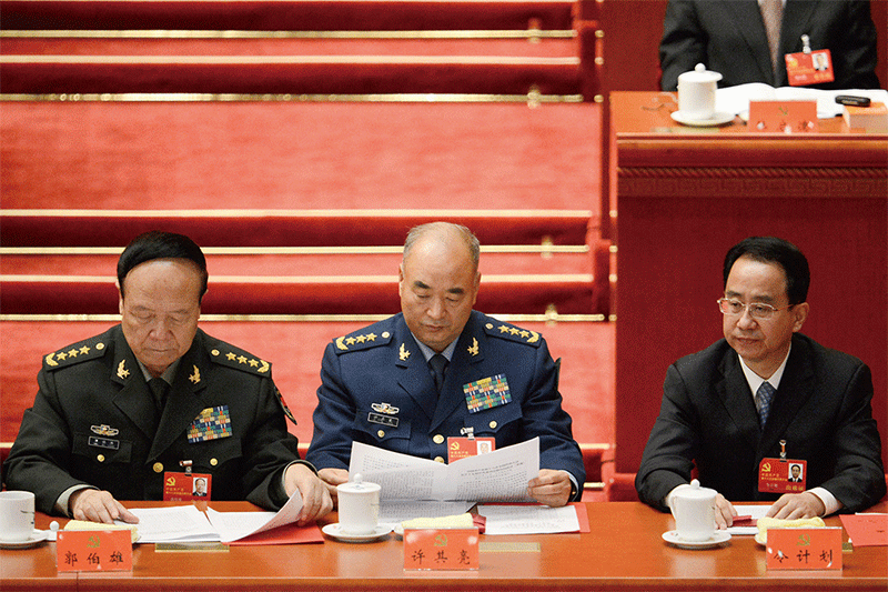 習近平軍中親信許其亮(中)公開批郭伯雄(左)、徐才厚架空軍委主席,暗指江澤民架空胡錦濤,釋放的政治信號令人關注。圖為2012年11月14日中共18大閉幕會。(AFP)