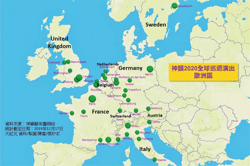 2020新演季,神韻將覆蓋歐洲至少9國32座城市,其中包括英國5座城市、法國6座城市、德國8座城市、意大利6座城市等。(新紀元製圖)