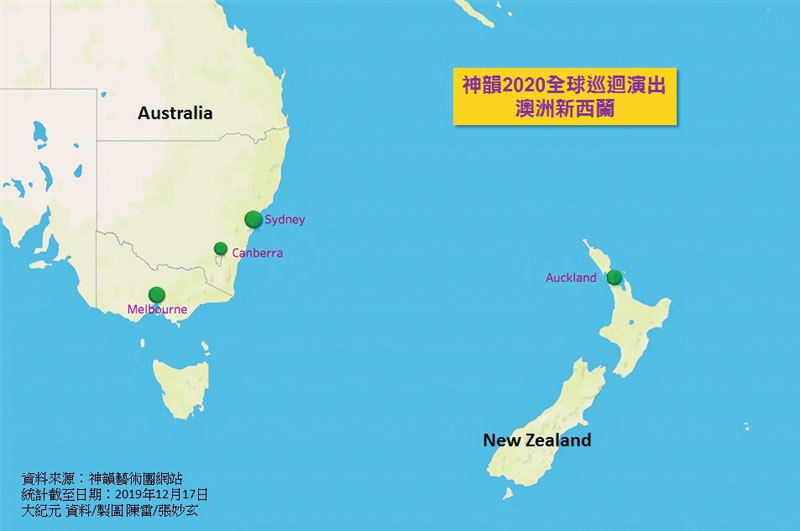 澳洲與新西蘭將於2020年2月底迎來神韻,在悉尼上演20場、墨爾本12場等。(新紀元製圖)