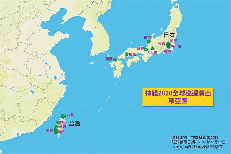 神韻2020亞洲巡迴演出,將涵蓋臺灣和日本十多個城市。(新紀元製圖)