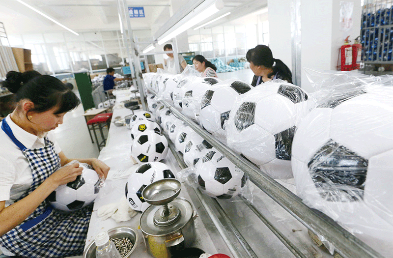 中共從制度的根基上就是否定私有制、打壓民企。民企需建立黨支部,並設立「特殊管理股」,官員想方設法抓住你的辮子,逼你捨財免災。圖為江蘇一民營足球製造廠。(Getty Images)