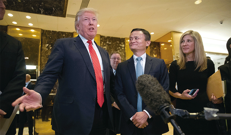 美國特朗普總統當選以後,馬雲設法跟特朗普認識,2017年1月9日獲特朗普會面,向特朗普承諾在美提供100萬就業機會,後來藉故中美貿易戰而不了了之。(Getty Images)