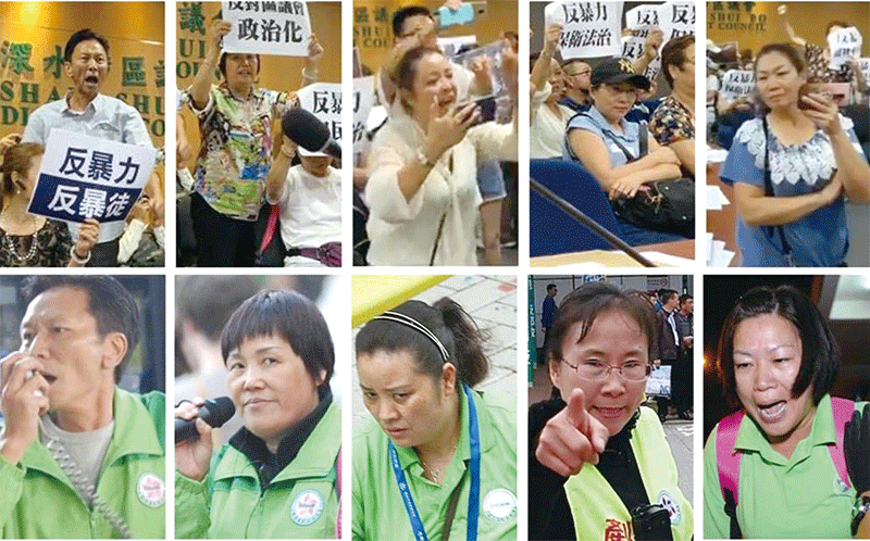 馬化騰是江派掌控的深圳同心俱樂部的常務副主席,同心俱樂部和香港滋擾法輪功的「青關會」屬關聯團體。圖為青關會成員。(大紀元製圖)