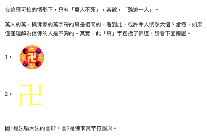 解讀了大災難的發生及時間,再解讀一下藏在讖中的神方。救命「神方」藏在第三句的「萬人不死」之中,「不死」就是能得救的意思。什麼人能得救。天機在「萬」字中。這個符號」卍」念萬字符,大家都知道是佛家的符號。但讖中說的「萬」是特有所指。請看下圖。