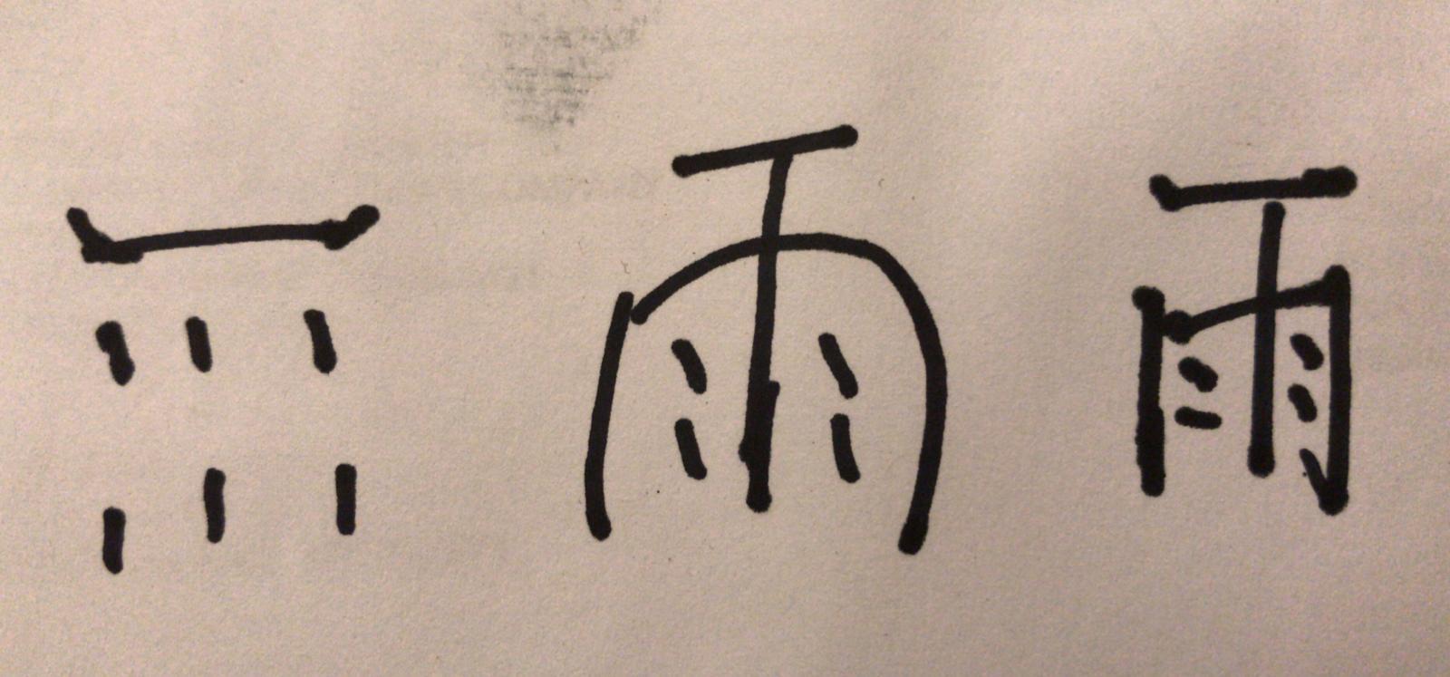 雨字上面的一橫象徵天,橫下面是個穹隆象形,象徵雲氣升騰,說明無雲不成雨。風流雲散,別流為雨。由此,穹隆下有四行雨點,每行三點,這個象意,四有四方,四維。三有雨露滋潤。天地氣和的而成甘霖。一生二,二生三,三生萬物。而今的簡體字是中共篡改,意思顛倒了。