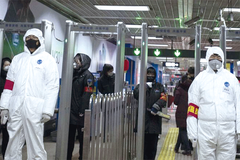 評論指只有專制制度才能做出這種武漢封城、不顧疫區未感染者基本人權的事。圖為武漢街頭「全副武裝」的安檢人員。(AFP)