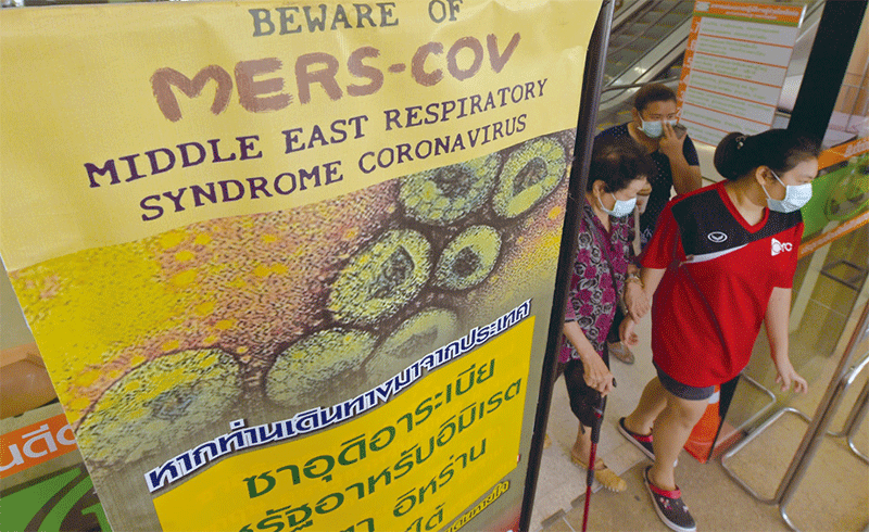 2013年5月4日,普拉莫博士收到一個冠狀病毒樣本,病毒來自一位沙特病人的肺部。圖為2015年6月19日,泰國一傳染病研究所門口警示中東呼吸綜合症(MERS)的海報。(AFP)