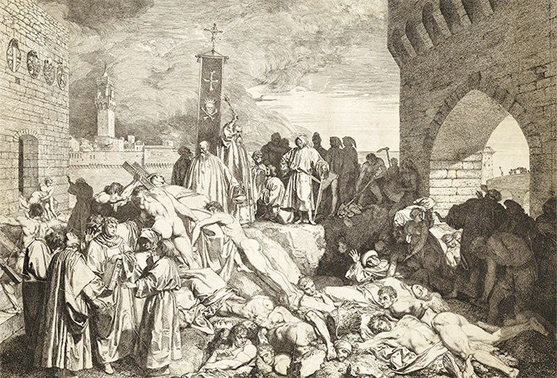 1347年蒙古兵以己方染疫屍體投入克里米亞圍城,瘟疫隨之輾轉侵襲歐洲,造成世界史上第二波瘟疫大流行。圖為1348年佛羅倫斯的瘟疫繪圖。(維基百科)