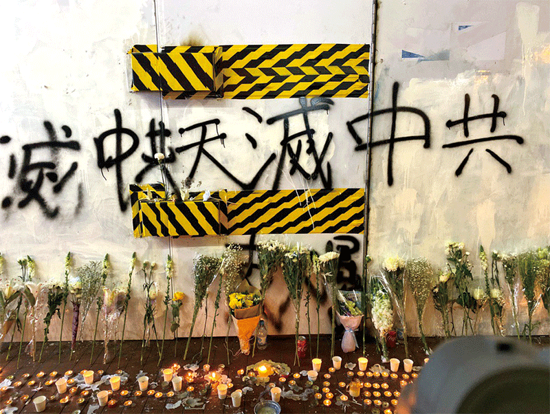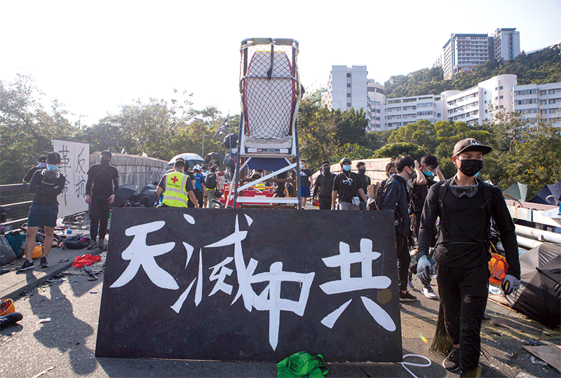 11月香港中大保衛戰時,中大學生在中大二號橋與警察對峙,學生在橋邊豎起「天滅中共」大橫幅,學生向大紀元表示:「豎起後,感覺心裡很踏實,似有神在護佑。」「天滅中共」四個字已然成為香港人的「護身符」。