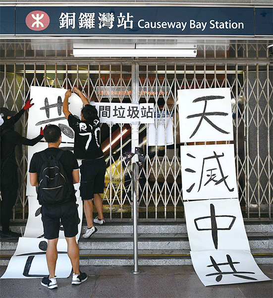2019年10月1日香港「沒有國慶只有國殤」遊行,有抗爭者在關閉的銅鑼灣地鐵站口布置標語牌「天滅中共」。(AFP)