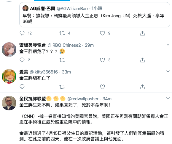 較早時間美國總檢查長在推特上說:「@AGWilliamBarr早餐:據報導,朝鮮最高領導人金正恩(Kim Jong-UN)死於大腦,享年36歲。」