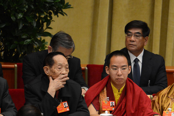 中國水稻專家袁隆平接受官媒採訪時坦言中國的糧食不夠吃,別國不賣就麻煩了。圖為袁隆平(左)2013 年參加中共兩會。(AFP)
