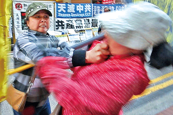 有爆料人說,孫力軍的大陸維穩系統提供給騷擾法輪功的香港青關會很多錢。圖為青關會成員2016年2月29日干擾法輪功真相點。(大紀元)