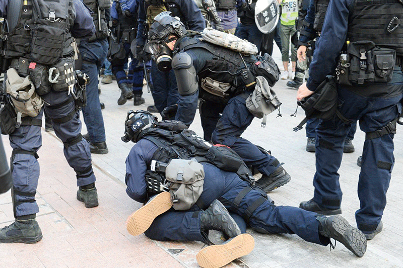 有評論稱,在警隊暴力拘捕和中聯辦強硬奪權的敏感時刻公布孫力軍落馬,突顯中南海內鬥激烈。圖為2019年12月1日兩名抗爭者遭暴力逮捕。(宋碧龍/大紀元)