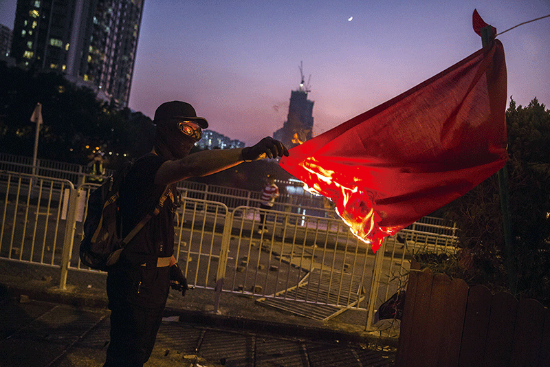 中共以往是藏在幕後,但近期中共撕破臉現形,讓港人目標明確,要全力抗共,同時推進全球抗共。圖為去年10月1日國殤日,抗爭者焚燒中共血旗。(AFP)