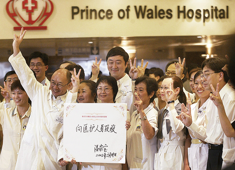 論醫學成就,沈祖堯(圖中)是六個國家和地區的院士;論校長評價,2010年起7年中大校長期間曾獲「香港最佳大學校長排名」榜首。圖為2003年6月30日香港威爾斯親王醫院的抗疫人員合影。(AFP)