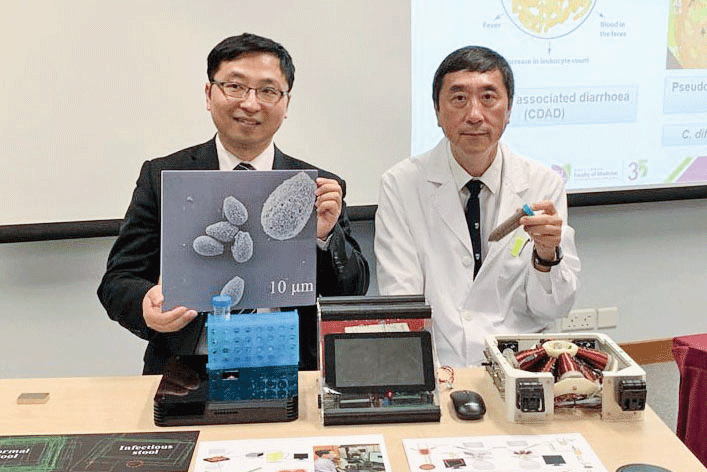 薩斯改變沈祖堯對人生的看法,他發現了對病人感同身受的「心藥」。圖為2019年2月13日中大研究團隊發表快速檢測艱難梭菌毒素成果,右為沈祖堯。(趙若水/大紀元)