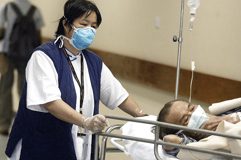 2003年薩斯爆發期間,沈祖堯所在的威爾斯親王醫院感染嚴重,病患及醫護人員被徬徨恐懼籠罩,愁眉緊鎖。(AFP)