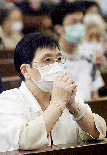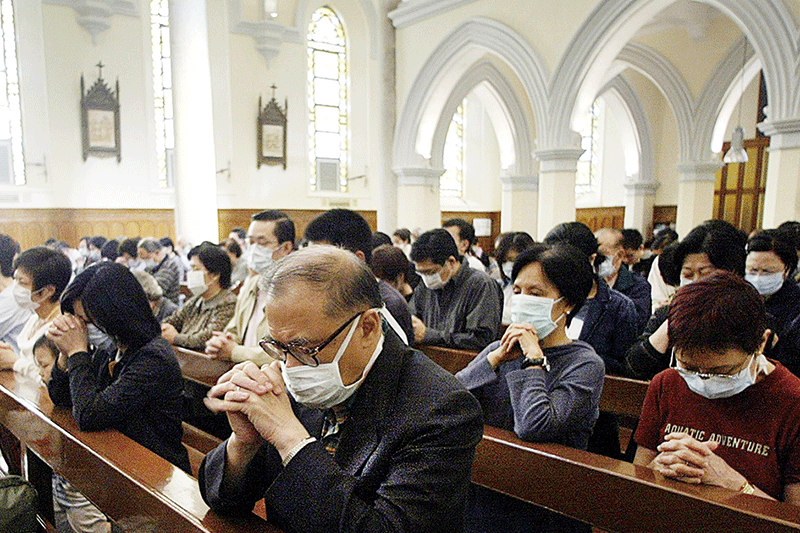 2003年3月薩斯爆發初期,醫院裡每天都是壞消息,在無助和絕望之際,沈祖堯召集基督徒醫護同事一起禱告,求救於掌管生命的上帝。圖為薩斯期間香港民眾在教會禱告。(AFP)