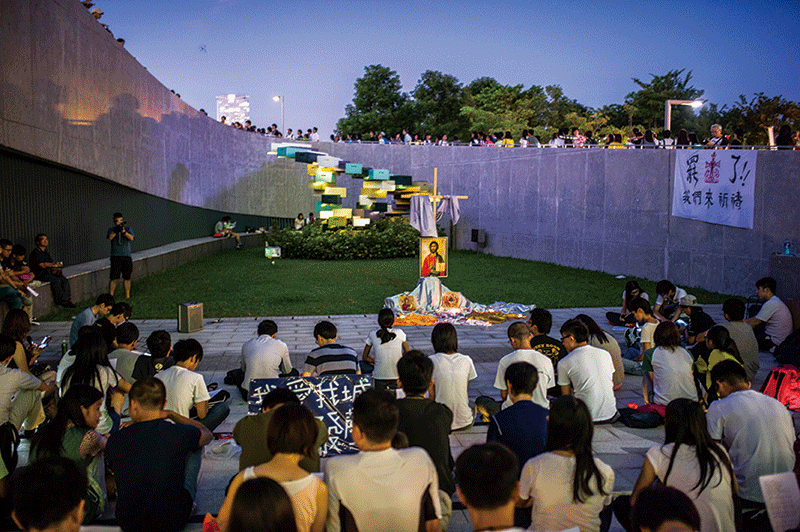 2014年9月29日,香港警方武力驅散令民憤大規模爆發,20萬市民逼爆主幹道參與佔中。圖為當天晚上親民主人士在添馬艦公園附近祈禱。(AFP)