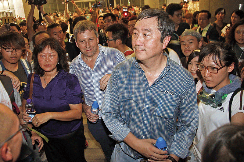 2014年10月2日晚間10時半,中文大學前校長沈祖堯現身特首辦現場看望學生,讚揚學生的表現,呼籲他們把安全放在第一位。(潘在殊/大紀元)