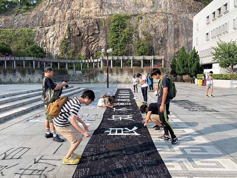 2019年10月23日,中大學生會把一幅寫有「良知不會被威權噤聲」大型橫額鋪放在校內烽火臺前,許多學生在上面寫下對校長段崇智的感謝及支持的心聲。(韓納/大紀元)