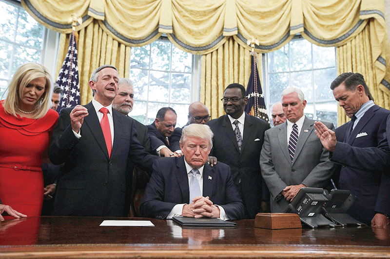 特朗普上任後曾多次帶領美國民眾虔誠地向神祈禱,避過災難。