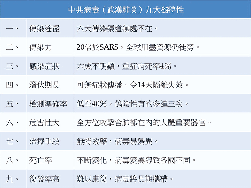各類醫學資料顯示,中共病毒具九大獨特性,使各國抗疫措施都失效,如欲保命而長期隔離,將致經濟癱瘓,未病死先窮死……