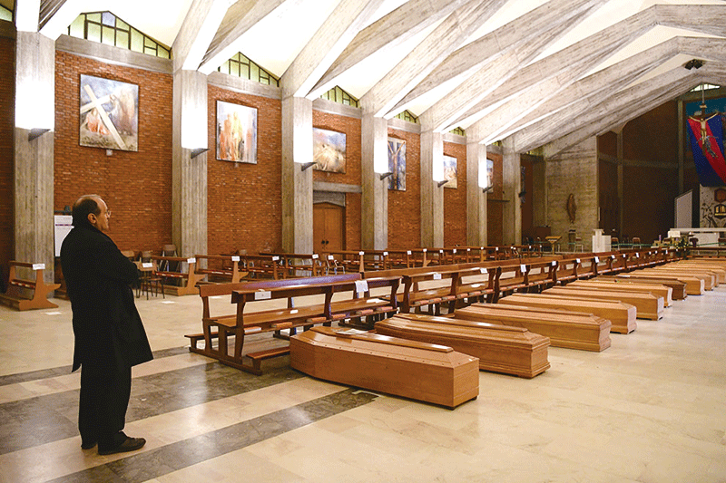 中共病毒比伊波拉病毒更危險,傳播率如同豬流感,死亡率不斷變化。圖為意大利倫巴底的教堂被用來放置中共病毒死者的棺木。(AFP)
