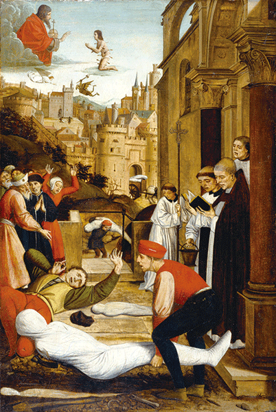 若斯.列菲林西(Josse Lieferinxe),〈聖塞巴斯蒂安代瘟疫災區向神祈禱〉(Saint Sebastian Interceding for the Plague Stricken),1497年作,美國巴爾的摩市沃爾特斯藝術博物館藏。(公有領域)