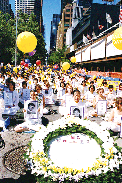 中共迫害法輪功已20多年。圖為部分法輪功學員於迫害第二年(2000年)在紐約集會悼念被迫害致死的學員,呼籲各國協助制止中共迫害法輪功。(明慧網)