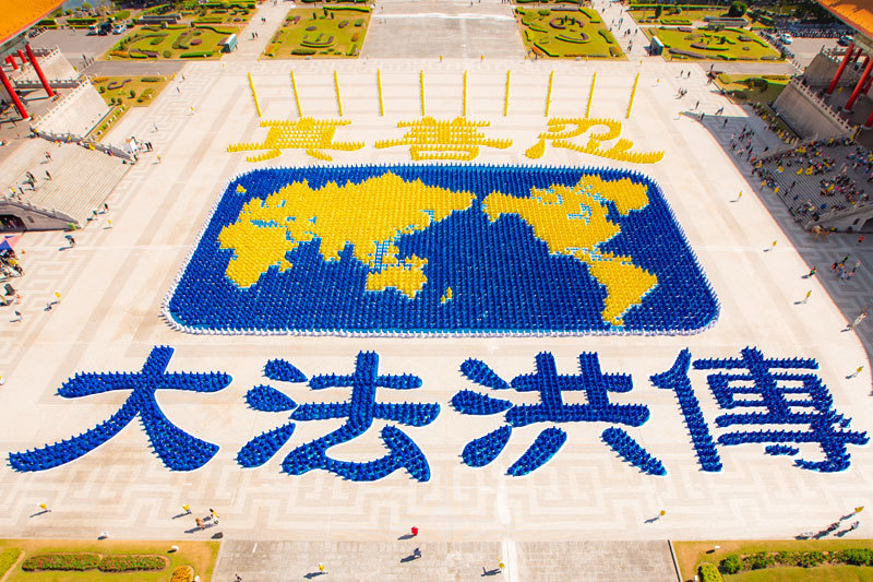 神韻藝術團的成員修煉佛家上乘法門「法輪大法」,要求心性達到「真、善、忍」的標準。圖為2019年11月16日,來自世界各地的部分法輪功學員齊聚中正紀念堂,排出「法輪大法洪傳世界」壯觀圖像。(陳柏州/大紀元)