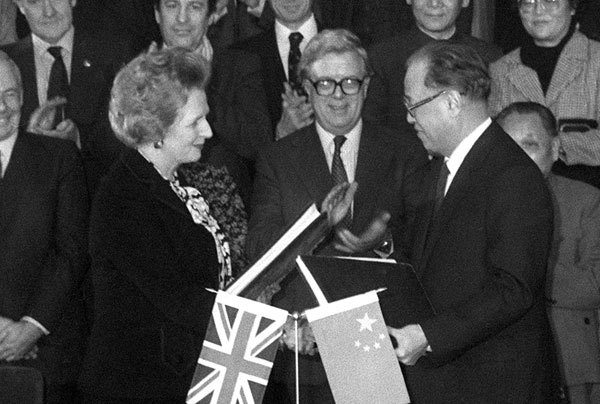 中共外交部去年有人說,《中英聯合聲明》是歷史文件,讓香港人和外國人大驚失色,嘆不可思議。圖為1984年12月19日中英簽署《中英聯合聲明》。(AFP)