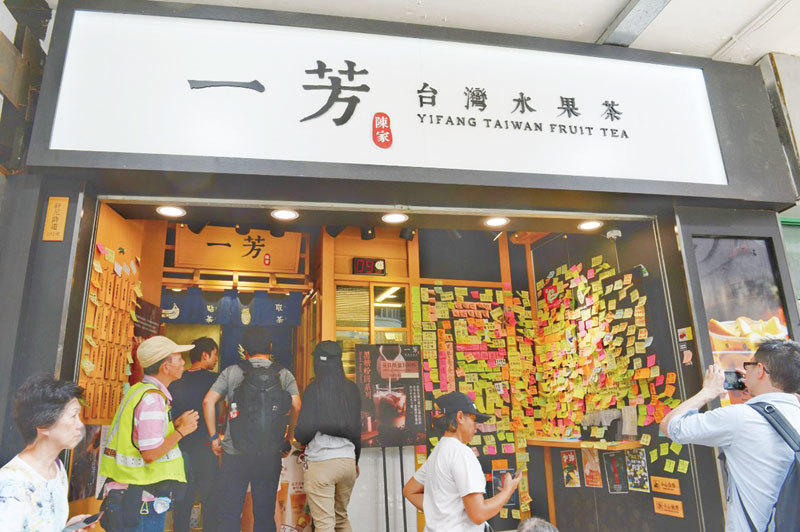 中共擅長製造「政治攬炒」,一芳水果茶總部去年因中共施壓曾針對反送中罷工發文稱維護「一國兩制」。圖為臺灣一芳水果茶提供連儂牆以挽回影響。(宋碧龍/大紀元)